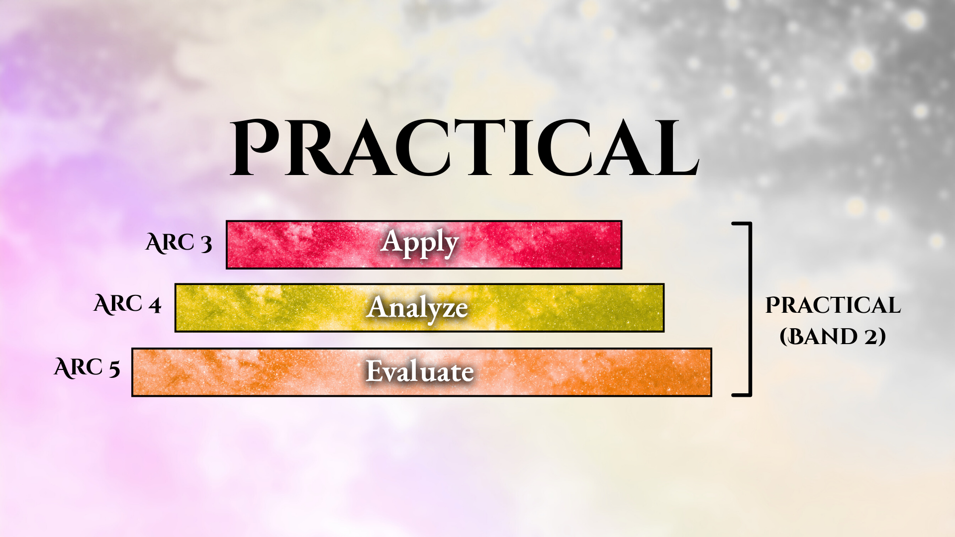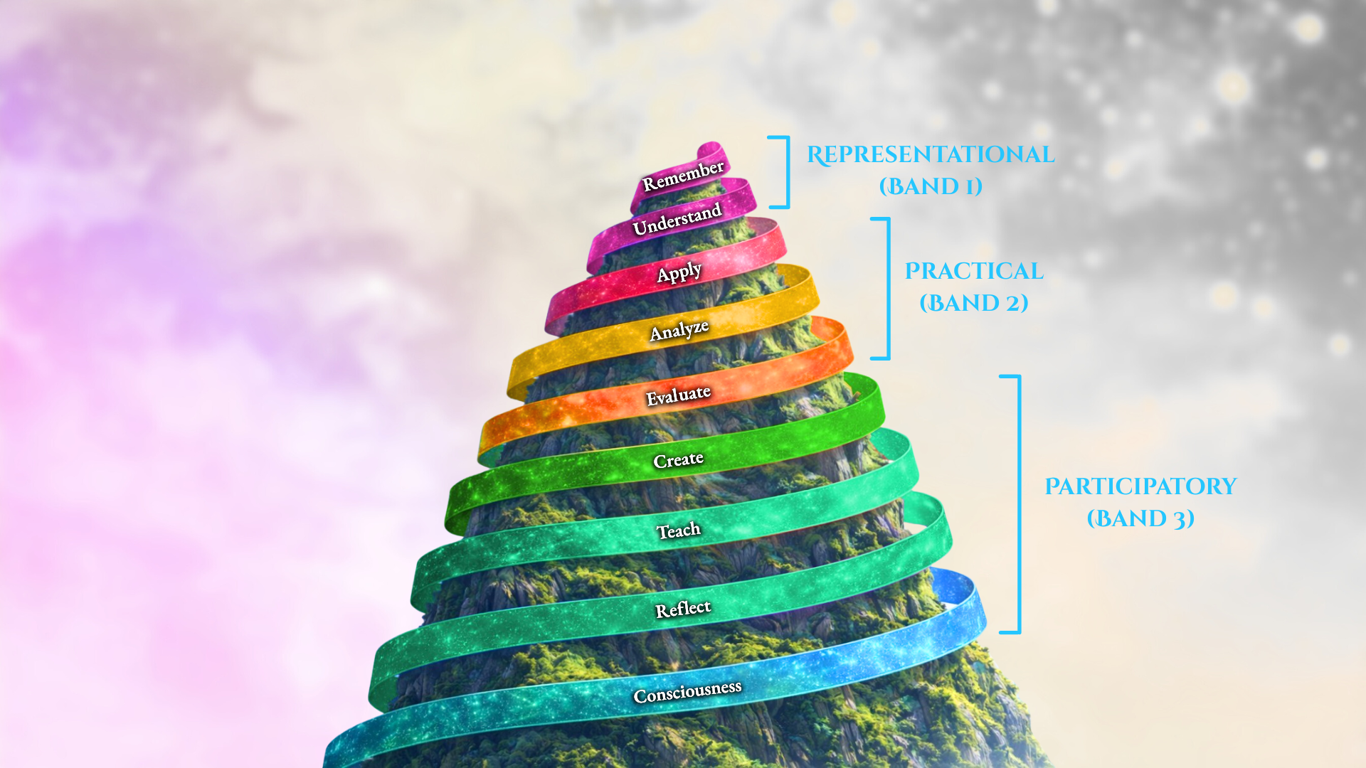 - Practical Band: Knowing how to apply, analyze, or evaluate something whether kinesthetic or mental as well as ones relative discernment of things. This Band is expressed by Representational Knowing and founded in Participatory Knowing.