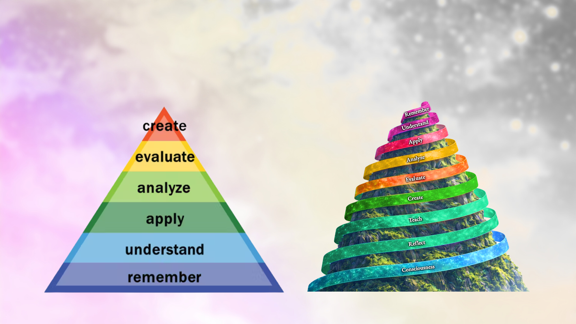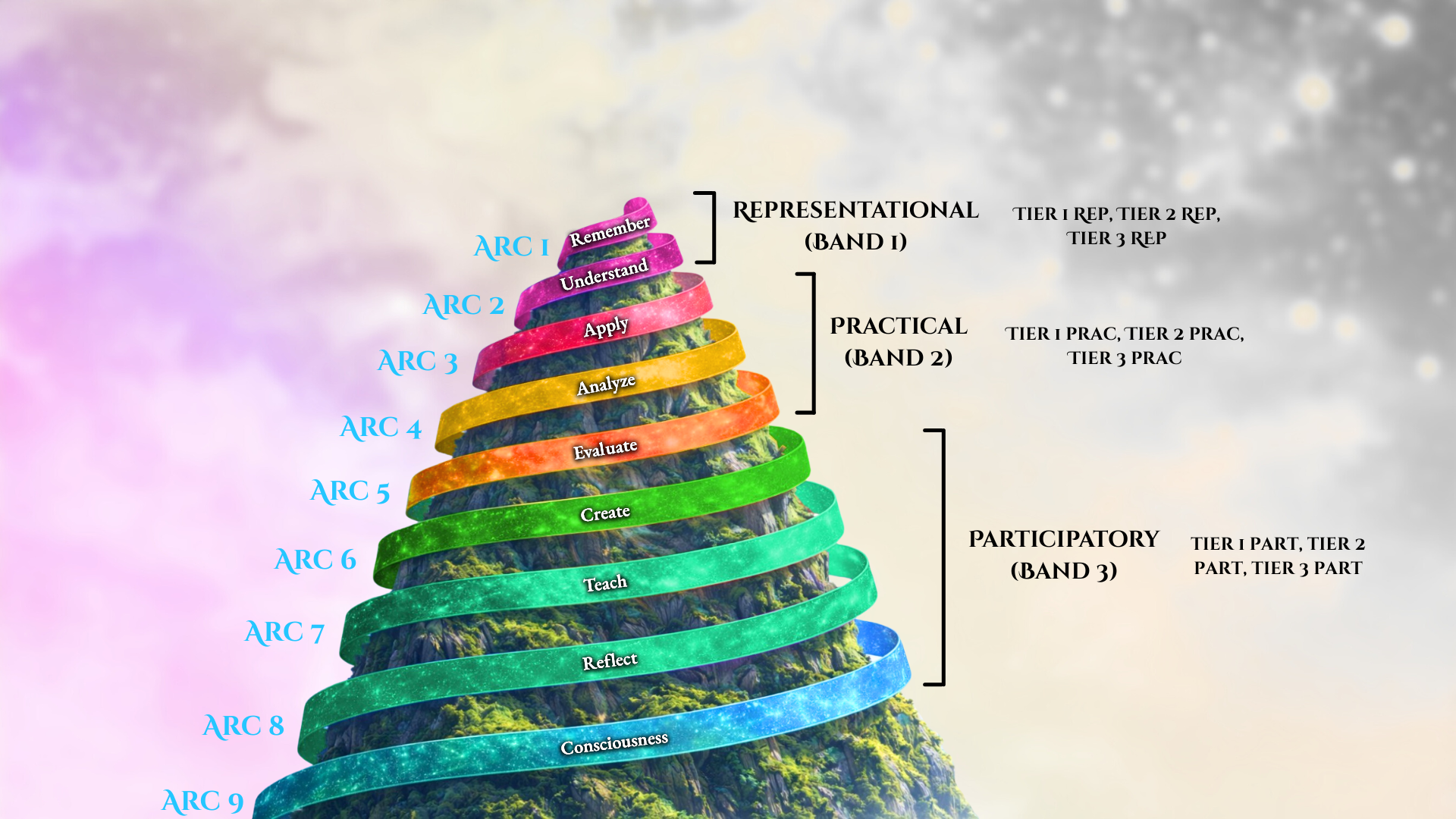 Think of the Arcs like the roots and branches of a single living tree. Explaining your understanding in words might look like the dazzling canopy, but itâs fed by roots sunk deep into earlier Arcs. When you descend into those deeper layersâEvaluation, Creation, Reflectionâitâs like descending into richer soil. Everything above grows stronger. Even the questions at shallower layers start tasting different, the way water tastes different after flowing over richer mineralsâhence the differentiation between Knowing Tiers.