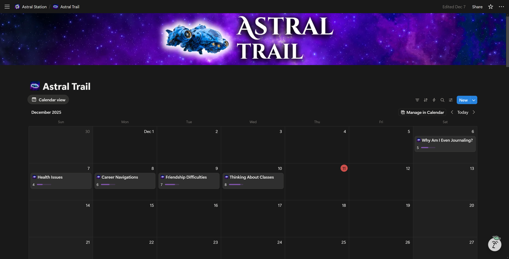 - Astral Navigation: Inspire your friends by how much you radiate calm, confidence, and purpose throughout college using a dedicated action and insight integration page